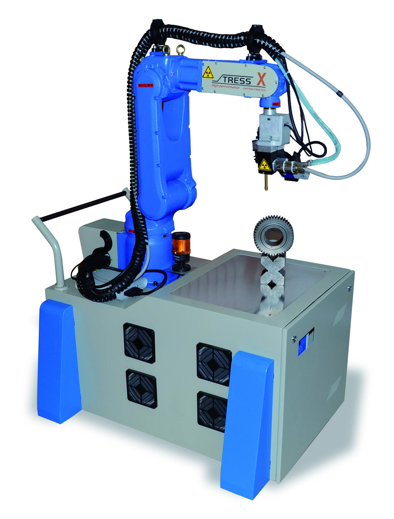 STRESS-X殘余應(yīng)力分析儀,符合ASTM E915及EN 15305殘余應(yīng)力國際分析檢測標(biāo)準(zhǔn)。儀器的衍射單元安裝在6自由度的機器人臂上,通過移動機械臂可對各種形狀和尺寸的樣品進行檢測。整個測試系統(tǒng)可封裝在密閉的艙體中用于實驗室分析,也可安裝在四輪合金推車上用于現(xiàn)場分析,進行移動測量大型工件各個部位的殘余應(yīng)力。