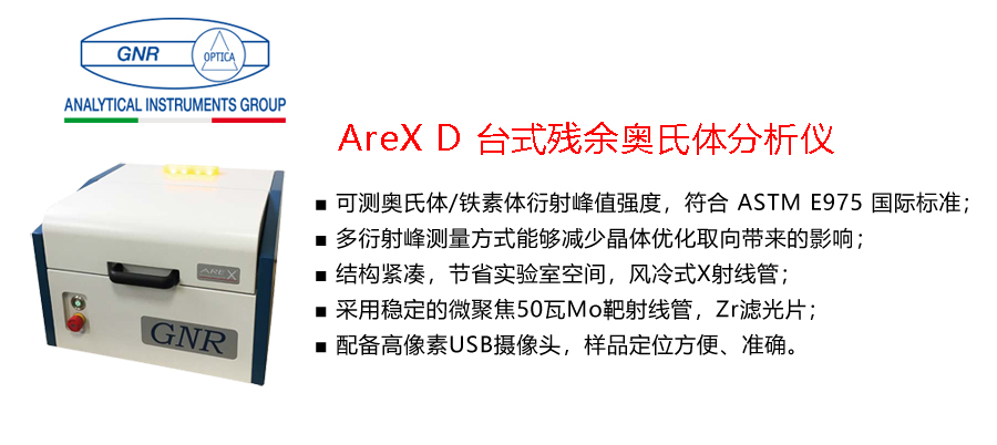 意大利GNR品牌 AreX D 臺式殘余奧氏體分析儀,符合ASTM發(fā)布的E975標(biāo)準(zhǔn)方法:X射線法測量近無規(guī)結(jié)晶取向鋼中殘余奧氏體的含量,及即將實施的 JB/T 14006-2020 標(biāo)準(zhǔn)。同時,AreX D 為專用的奧氏體分析儀,無需在傳統(tǒng)XRD基礎(chǔ)上再進(jìn)行復(fù)雜調(diào)試,即開即用,可快速獲取測量結(jié)果。