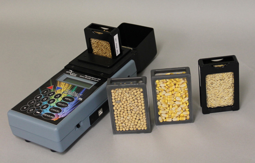 打開(kāi)鋁箱后,除主機(jī)(尺寸26 x 12 x 9 cm,重量?jī)H有1.5 kg)外,產(chǎn)品還附帶標(biāo)準(zhǔn)品及幾款不同規(guī)格的樣品杯,用于填充不同類(lèi)型的樣品,如小麥、大麥、玉米、大豆、高梁、油菜籽、豆粕等。