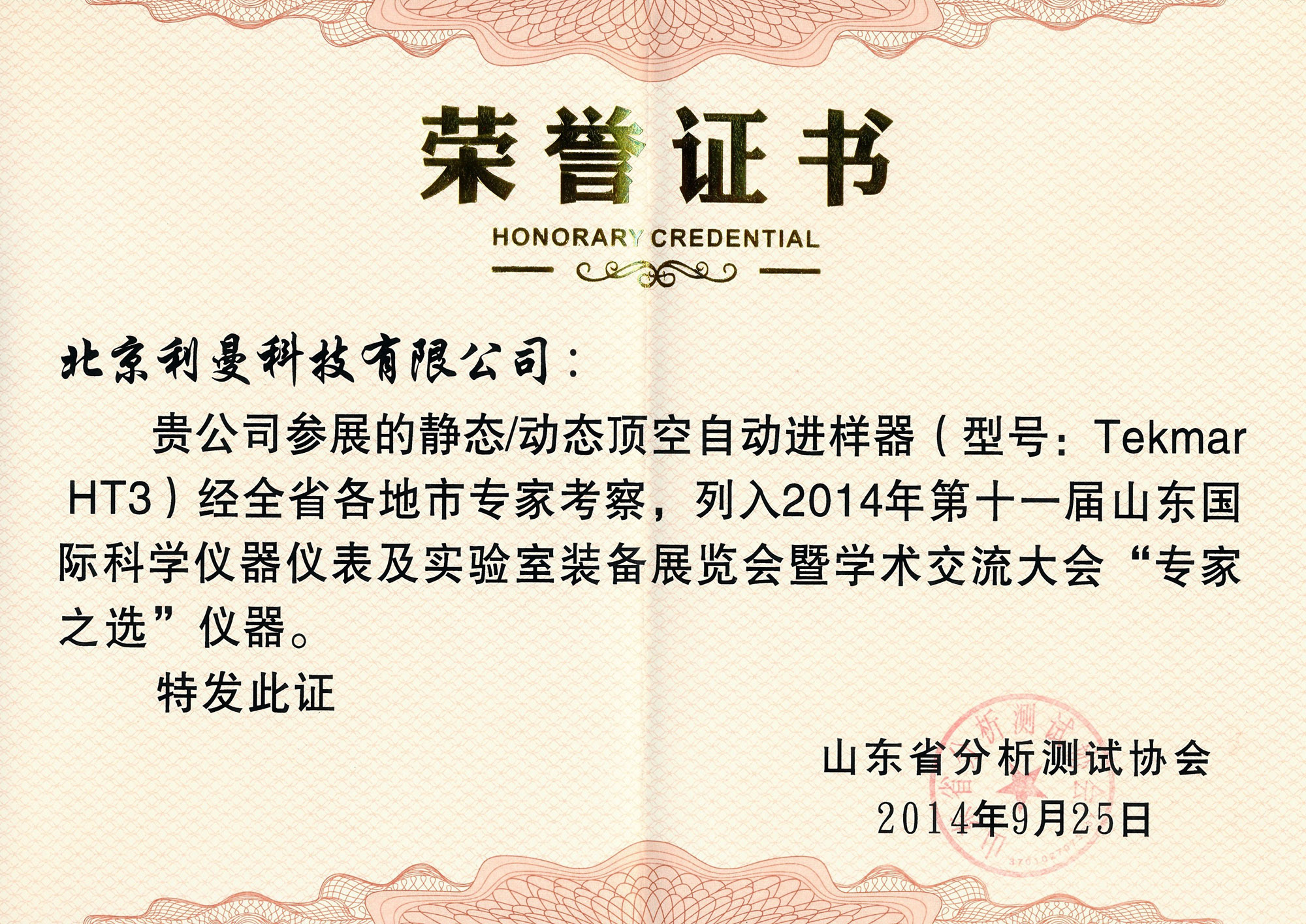 喜訊:美國Tekmar公司旗下 HT3靜態(tài)/動態(tài)頂空自動進樣器被列入第十一屆山東國際科學儀器儀表及實驗室裝備展覽會“專家之選”儀器,該項殊榮經(jīng)山東省各地市分析測試專家考察評比,由山東省分析測試協(xié)會頒發(fā)證書。